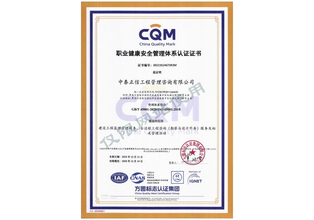 职业健康安全管理体系认证证书